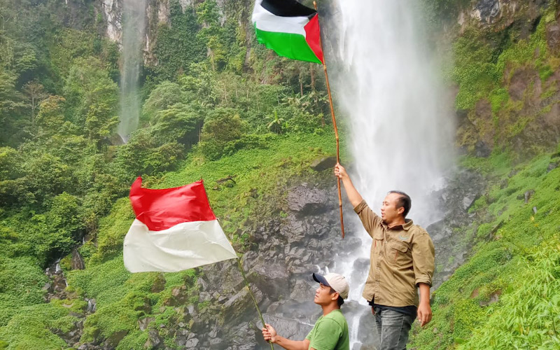 Sebagai aksi nyata, Yuga dan kawan kawannya melakukan aksi mengibarkan bendera Palestina berdampingan dengan Bendera Merah Putih yang dilakukan di Curug Cileat, Desa Mayang, Kecamatan Cisalak, Subang, Jawa Barat, pada Rabu (29/05/24).