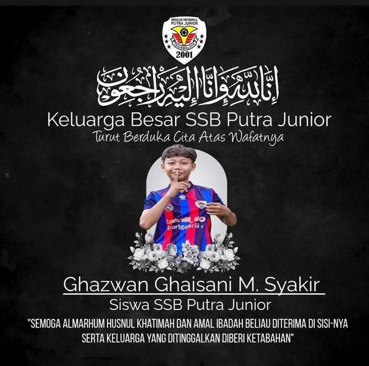 Intiraya | Ghazwan Ghaisani M Syakir, baru berusia 13 tahun dan masih duduk di bangku SMP. Siswa SSB putra Junior Tasikmalaya ini dinyatakan meninggal setelah dia dan temennya di bacok segerombolan geng motor yg melintas di jalan Letjen Mashudi Kota Tasikmalaya, Ahad 22 September 2024 sekira pukul 02.00 wib.