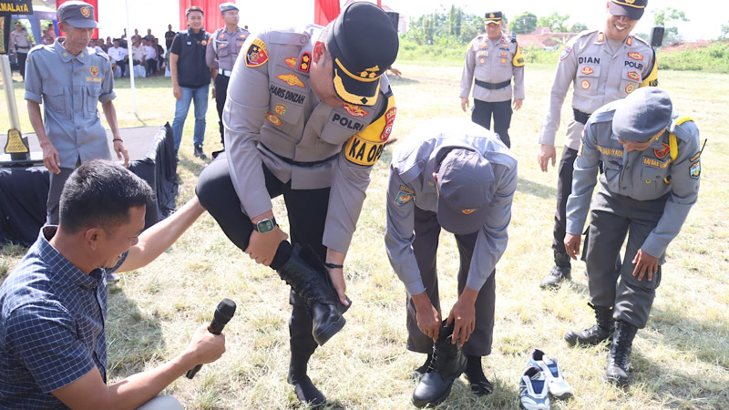 “Malahan saya lihat ada yang pake sepatu untuk jalan jalan, jadi saya spontan aja. Sepatu yang saya pake dikasih dan kebetulan pas ukuranya sama. Kan ada dua sepatu saya. Semoga bermanfaat dan bisa dipake tugas,” kata AKBP Haris Dinzah.