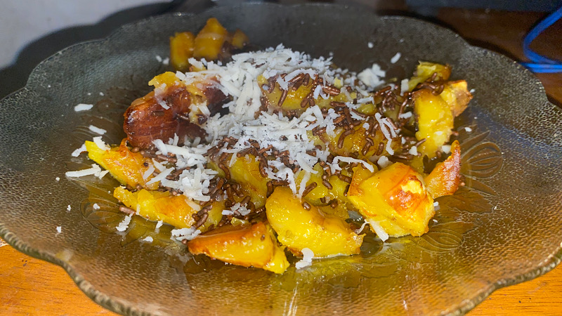 Hanya di goreng, tapi tetap ditambahkan toping seperti parutan keju, seres coklat dan juga susu kental.